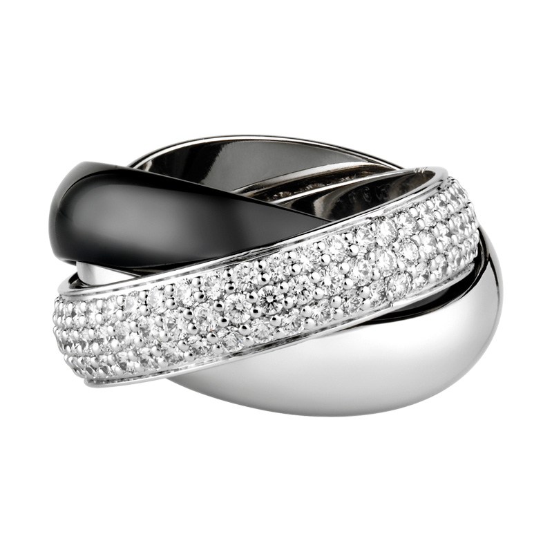 Опис Кільце з білого золота 18 карат з трьох каблучок: одне кільце прикрашене 129 діамантами, одне виконане з білого золота, одне з чорної кераміки Велика модель Ширина кожного кільця: 5,4 мм