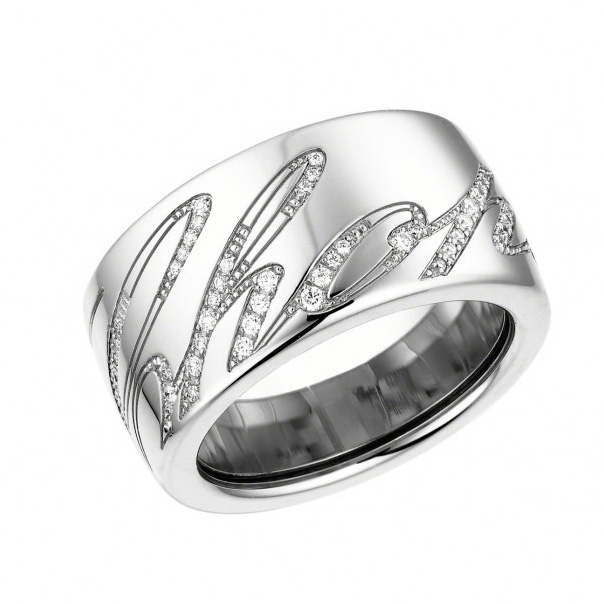 Опис Перстень з білого золота 750 проби з діамантами (0,28 карат) прикрашений гравіюванням з каліграфічно виписаним логотипом Chopard