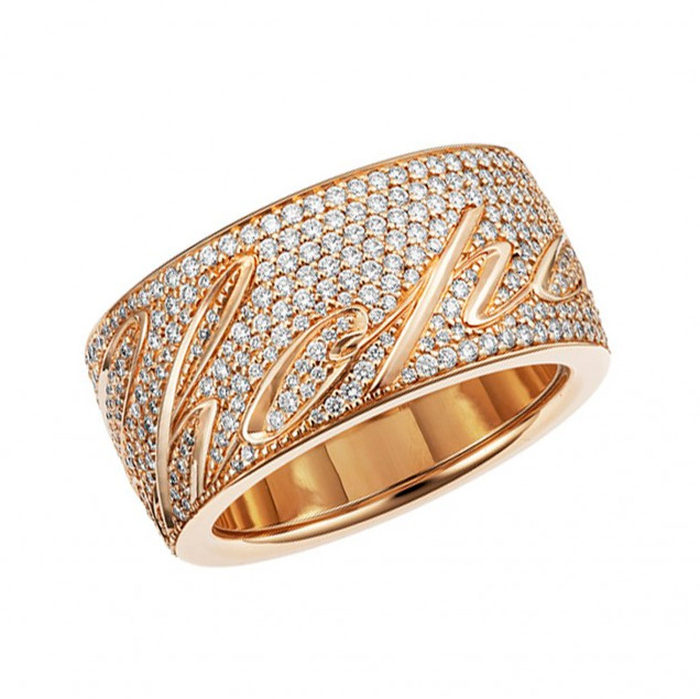 Перстень Chopard Chopardissimo ref: 827531-5110 з рожевого золота 750 проби з діамантами (1,76 карат) прикрашений гравіюванням з каліграфічно виписаним логотипом Chopard.