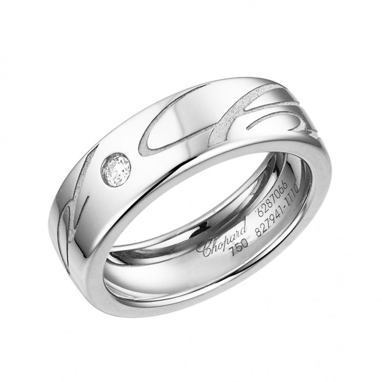 Опис Каблучка з білого золота 750 проби з діамантом (0,04 карат) прикрашена гравіюванням з каліграфічно виписаним логотипом Chopard
