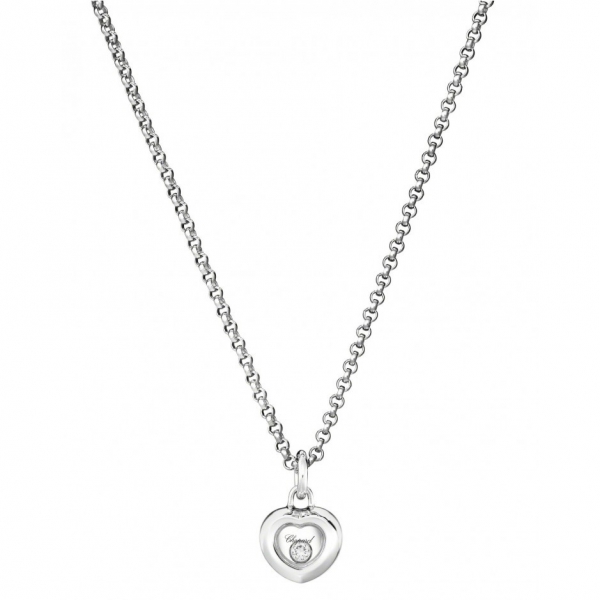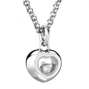 Підвіска Chopard Happy Diamonds Miss Happy ref: 799006-1001 із білого золота 750 проби з діамантом (0,03 карат), який вільно ковзає між двома сапфіровими шибками.