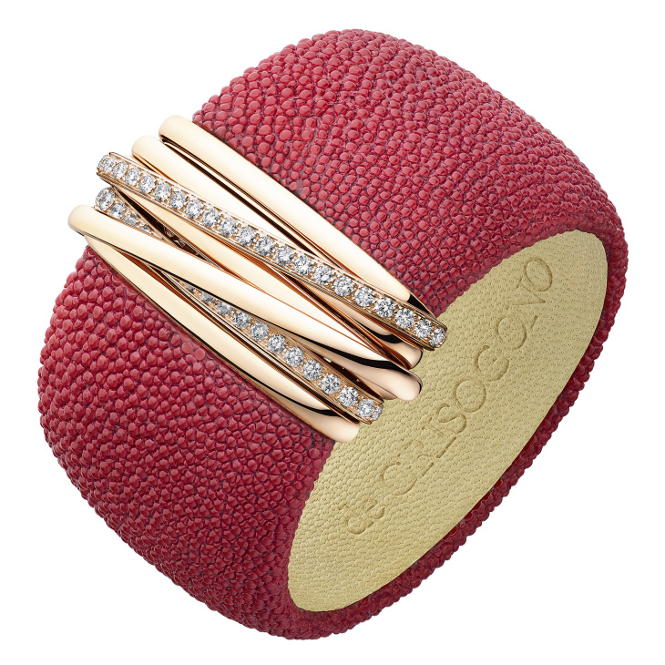Браслет de Grisogono, колекція Allegra. Браслет із шкіри ската червоного кольору з елементами з рожевого золота 750 проби та білими діамантами.