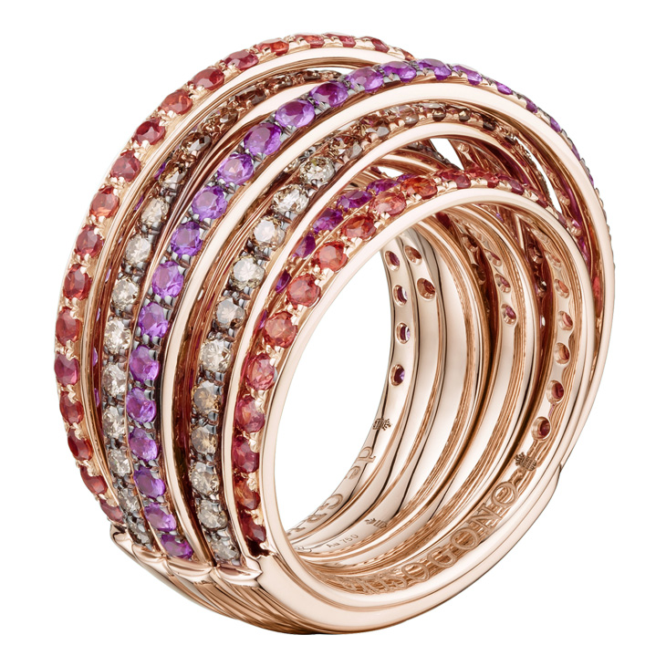 Кільце de Grisogono, колекція Allegra. Кільце з рожевого золота з коричневими діамантами, оранжевими та рожевими сапфірами.