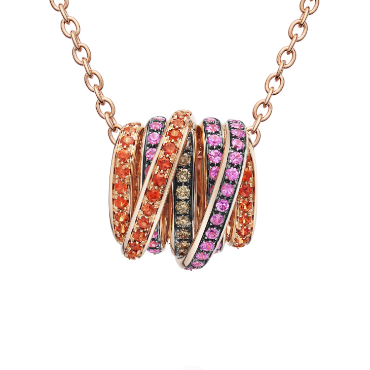 Підвіска de Grisogono, колекція Allegra. Підвіска з рожевого золота з рожевими та оранжевими сапфірами та коричневими діамантами. Підвіска на ланцюжку із рожевого золота.