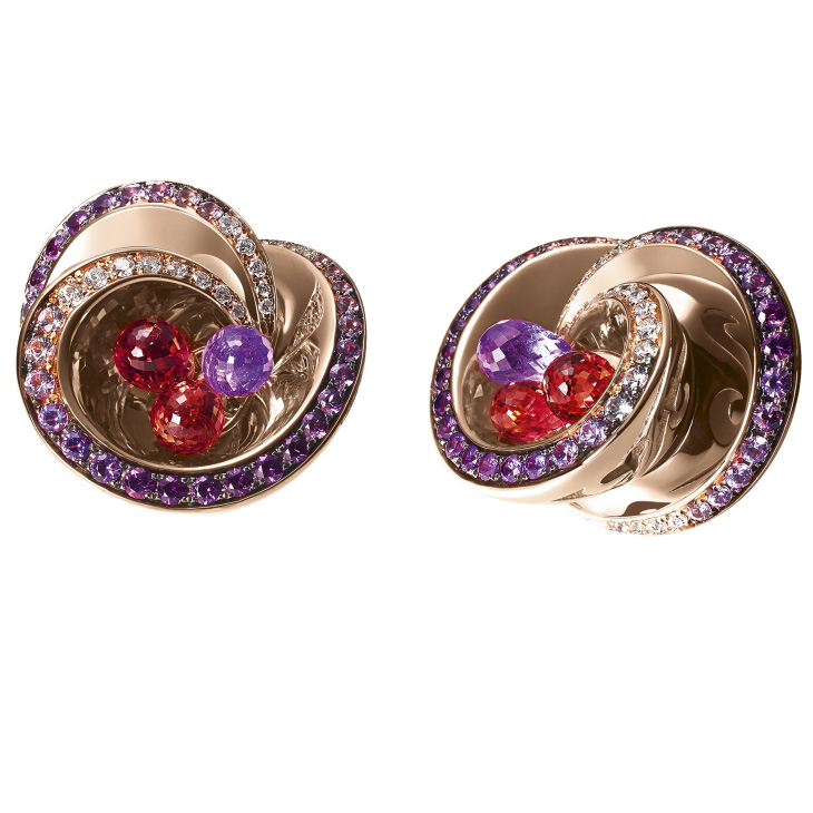 Сережки de Grisogono, колекція Chiocciolina. Сережки із рожевого золота 750 проби з білими діамантами, рожевими сапфірами, рожевими сапфірами огранювання «бріолет», рубеліти ограновування «бріолет».