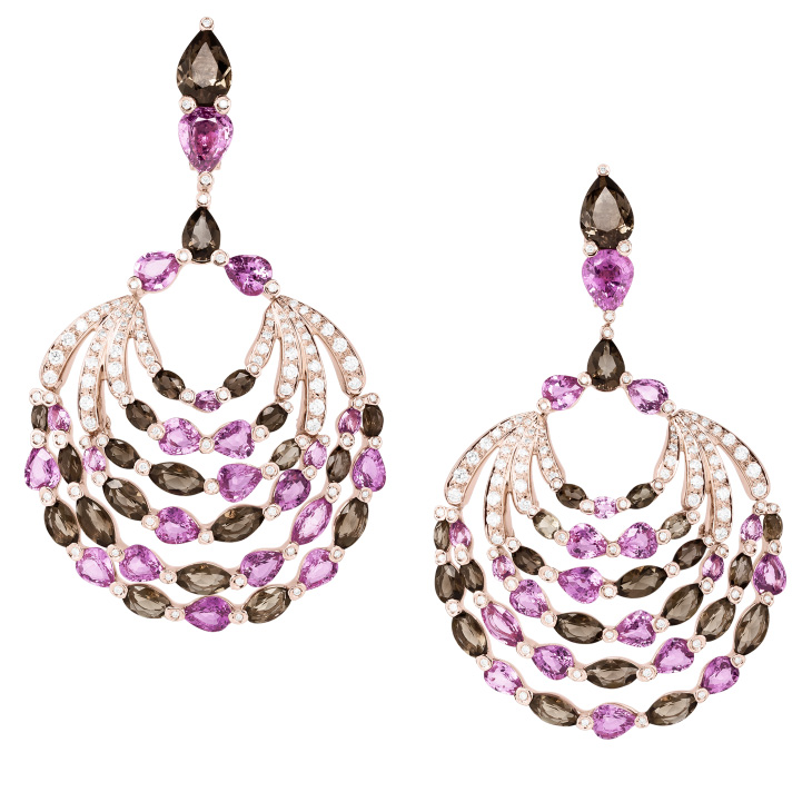 Сережки de Grisogono, колекція Melody Of Colours. Сережки з рожевого золота. 43 елементи з димчастого кварцу, 41 рожевий сапфір, 212 білих діамантів.