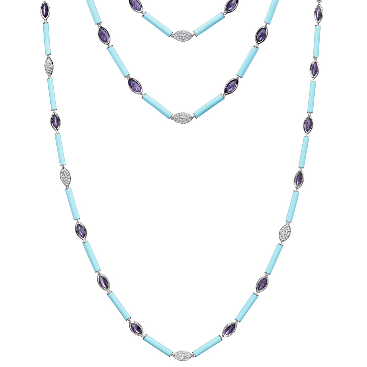 Намисто de Grisogono, колекція Melody Of Colours. Намисто із білого золота з аметистами огранювання «човник», елементами з бірюзу та білими діамантами.