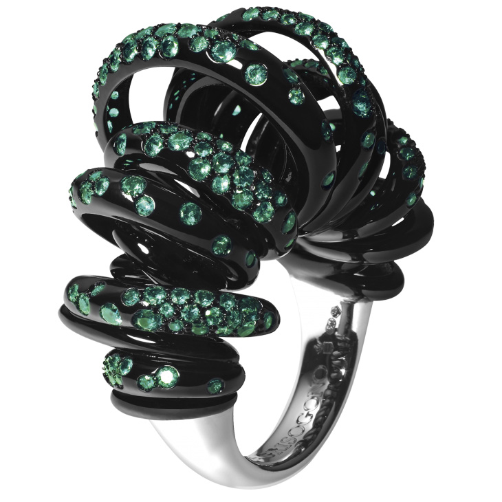 Кільце de Grisogono, колекція Sole. Кільце з білого золота 750 проби з чорним нанокерамічним покриттям та смарагдами.