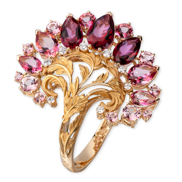 Кільце Genus з колекції Magerit Gea. Кільце з жовтого золота з білими діамантами та рожевими топазами та агатами.