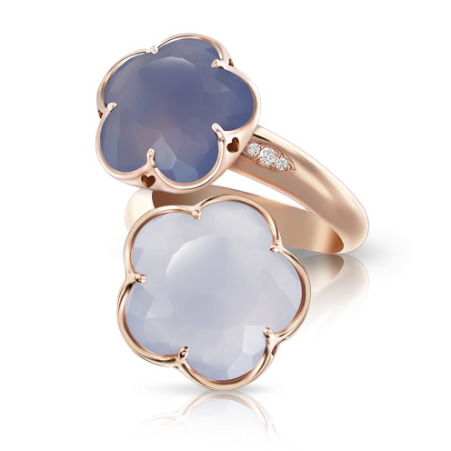 Кільце Pasquale Bruni з колекції Bon Ton. Перстень із рожевого золота з блакитними кварцами халцедонами у вигляді квіток і білими діамантами.