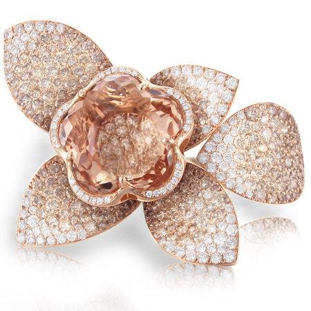 Кільце Pasquale Bruni із колекції Secret Gardens Haute Couture. Перстень з рожевого золота з білими діамантами, діамантами кольору "шампань" і морганітом у вигляді квітки.