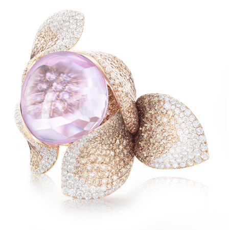 Кільце Pasquale Bruni із колекції Secret Gardens Haute Couture. Перстень з рожевого золота з білими діамантами, діамантами кольору "шампань" та кунцитом.