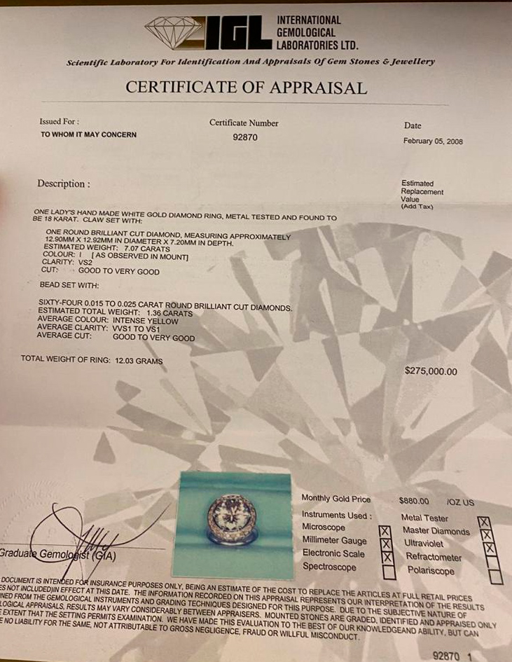 Характеристики Кільце з діамантом 7,06ct, біле золото