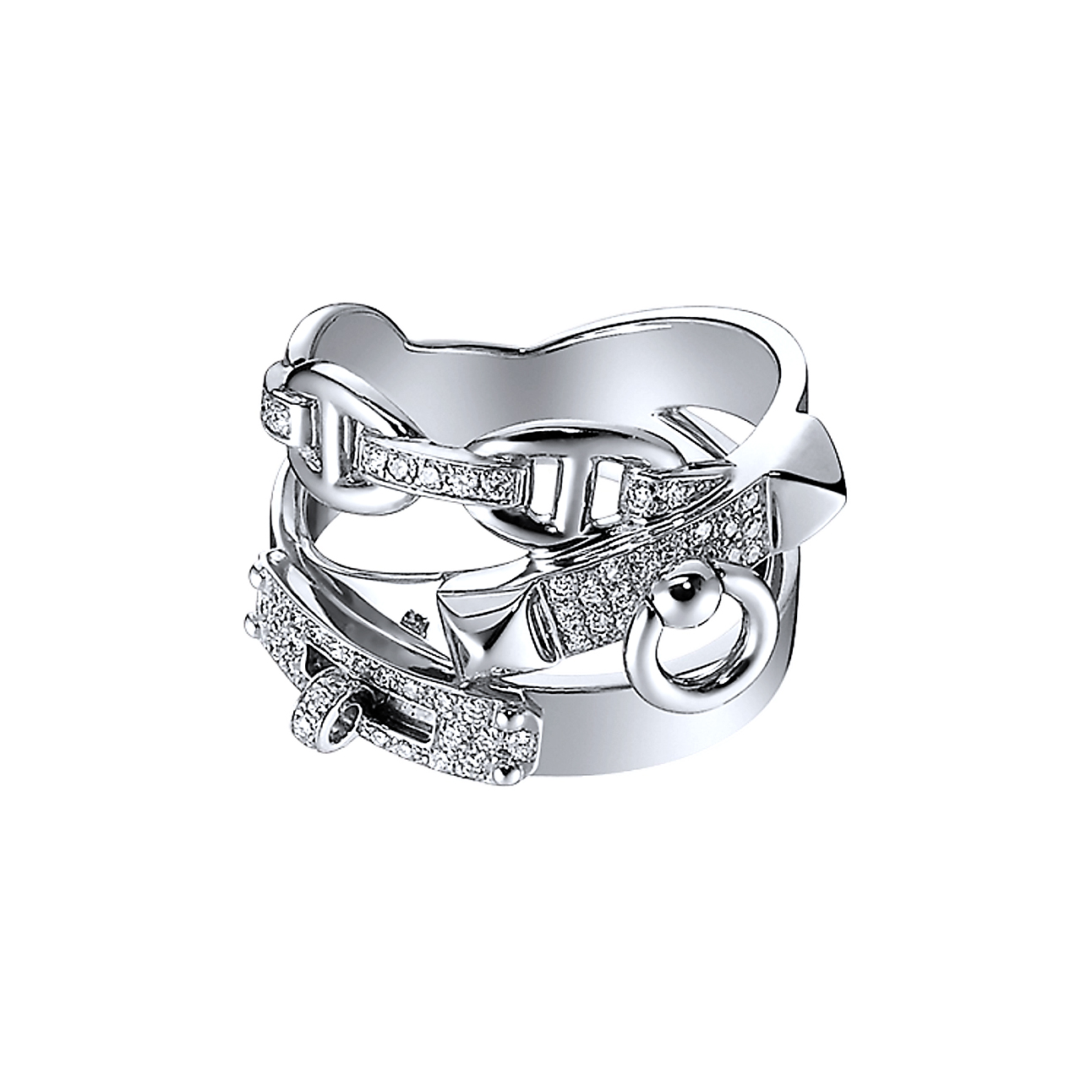 Каблучка Hermes Alchimie з білого золота 750/1000, шириною 1.51 cm. 66 діамантів загальною каратністю 0.32 ct.