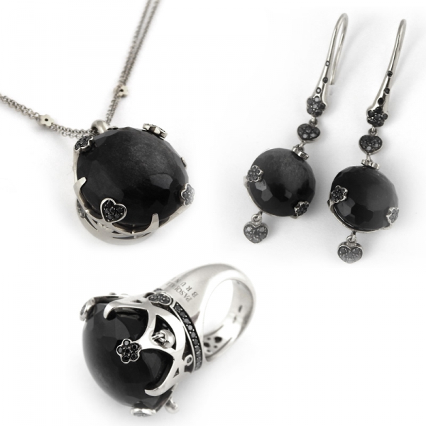 Опис Набір Pasquale Bruni, підвіска, сережки, каблучка, біле золото 750, чорні діаманти загальною вагою 1,7ct, обсидіани
