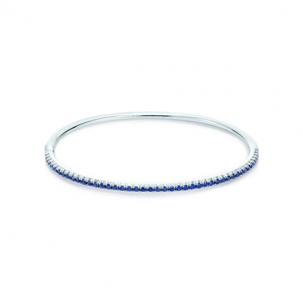 Ця елегантна модель настільки універсальна, що її можна носити щодня. Шарнірний браслет Tiffany Metro ref: 33475152 з білого золота, 18 K, із сапфірами по половині кола. Розмір Medium, коло зап'ястя до 15,75 см. Загальна вага у каратах 0,80.