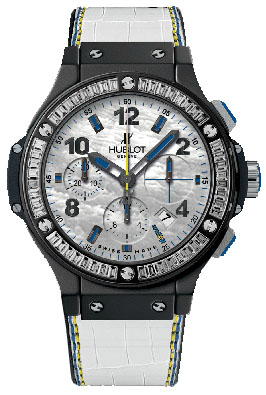 Механізм автоматичний, калібру HUB 4300. Корпус - чорна кераміка 41мм. Безель із 18к білого золота інкрустований 48 багетними діамантами 2,23ct.