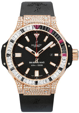 Самозаводящийся механізм HUB 21. Корпус з рожевого золота 18 карат з діамантами. Базель, що обертається, з рожевого золота 18 карат з 36 діамантами багетного ограновування, 8 рубінами багетного ограновування. Чорний циферблат. Чорний каучуковий ремінець.