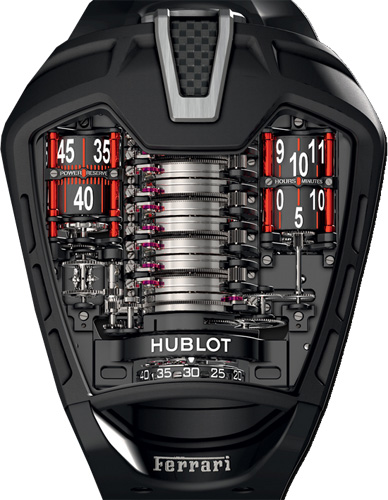 Новинка 2013 року Mp -05 LaFerrari 2013 являє собою спеціальну серію, повністю розроблену та створену компанією Hublot за допомогою інженерів та годинникарів знаменитої "LaFerrari". У демонстрації та свідчення того, що механізм досяг історичного максимуму з 50-денним запасом ходу. Крім того, годинник створено з 637 деталей. Годинники та автомобіль: MP-05 "LaFerrari" була розроблена - у технічних та дизайнерських рамках - повністю паралельно з автомобілем, поряд з командами Ferrari. Вони мають низку загальних пунктів. Модель може похвалитися не менше ніж 637 компонентів для механізму, який також обладнаний турбійоном, а також запас ходу близько 50 днів завдяки своїм 11 барелів, розташованих у лінію так само, як хребетний стовп і взаємопов'язаних так, що вони не кожному розряду, у свою чергу , але підтримують один одного, цей годинник ближче до годинника концепції. Годинник тонкої роботи з погляду форми, що відрізняється складною форми сапфірове скло чітко нагадують контури автомобіля, а також відкрита задня кришка, та зроблений із чорного PVD титан. Він увінчаний титану та вуглецю вставкою в центрі, розкриваючи обмотки корони.