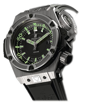 Нова модель King Power Diver 4000m Titanium, представлена швейцарською годинною компанією Hublot, відрізняється, як і випливає з її назви, вражаючою водонепроникністю - 4000 метрів. Корпус титановий діаметром 48 мм. Захищена заводна головка, що загвинчується, на 4 годинах. Безель на шести гвинтах. Циферблат чорний; годинникові індекси, годинникова та хвилинна стрілки із зеленим люмінесцентним покриттям. По його периферії є внутрішній дайверський безель, що обертається, який управляється головкою, розташованою на корпусі на 2 годинах, і забезпеченою блокувальною системою (останню див. крупним планом на нижній картинці). Модель оснащена автоматичним механізмом із функціями індикації годин, хвилин, секунд (центральні стрілки) та дати (в апертурі на 3 годинах). Чорний каучуковий ремінець із зеленим логотипом бренду. Лімітований випуск 1000 екземплярів.