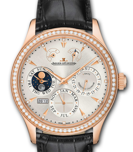 Компанія Jaeger-LeCoultre випустила нову модель під назвою Master Eight Days Perpetual 40 у класичному стилі, оснащену однією з найпопулярніших функцій – вічним календарем. На білому циферблаті накладні золоті годинникові індекси та стрілки, симетрично розташовані покажчики запасу ходу та дня/ночі на 11 та 13 годинах відповідно, стрілочний круговий покажчик дати на 3 годинах, покажчик місяця на 6 годинах, прямокутна апертура покажчика року між 7 та 8 год. а також покажчик дня тижня та фаз Місяця на 9 годинах. У корпусі з 18К рожевого золота інкрустований 72 діамантами ~0.82 carats встановлено зібраний та декорований вручну мануфактурний механізм із ручним заводом JLC 876-440B із двома заводними барабанами та запасом ходу 192 годин. Помилуватися механізмом можна через прозору задню кришку корпусу. Новинка доповнена ремінцем зі шкіри крокодила із застібкою із рожевого золота.