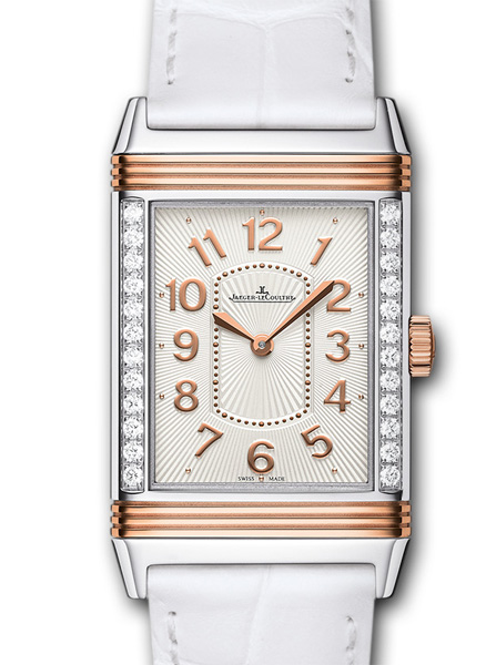 Нова стильна модель Reverso Grande Lady Ultra Thin випущена в 2013 році, не залишить байдужою жодну жінку і буде особливо цікава любителькам поєднання білого та рожевого металу, оскільки така модель підійде на всі випадки життя. Годинник має нове обличчя і характер, гладкі поліровані кути та тонкі лінії надають новинці нового дихання та витонченості. Майстри зробили корпус максимально тонким 7.2мм, для більшого комфорту та легкості. Що безсумнівно радує, що цей тонкий корпус вміщений механізм з ручним заводом Jaeger-LeCoultre Calibre 846/1 з частотою коливань балансу - 21 600 пк/годину має 18 каменів, товщина 2,94 мм, 93 деталі, запас ходу 40 годин. Елегантні, витончені годинна і хвилинна стрілки з рожевого золота гармонійно поєднуються з вираженими арабськими цифрами на білому циферблаті, що гільошує, і деталями корпусу, заводної головки так само виконаної з 18 каратного рожевого золота. Безель інкрустований 24 діамантами ~0.39 карат. Білий шкіряний ремінець із розкладною застібкою розміру 16мм.