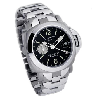 Моделі Luminor GMT відрізняються лаконічним діловим дизайном. Функції, якими володіють цей годинник, настільки ж продумані і корисні: на чорному циферблаті розташований додатковий циферблат для контролю за другим часом і кругле віконце дати. Частота 28 800 напівколивань на годину, 21 камінь. Корпус титановий 44 мм. Циферблат чорний. Запас ходу близько 42 години. Водонепроникність 300 м. Скло - сапфір з покриттям антивідблиску. Браслет із титану з нержавіючої сталлю, застібка системи Panerai.