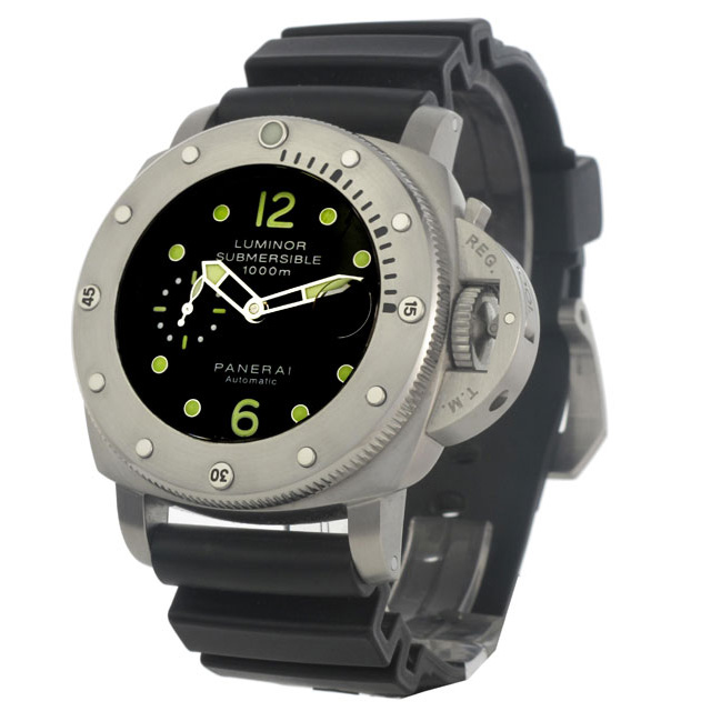 Створений спеціально для дайвінгу, годинник Luminor 1950 Submersible витримує занурення на 1 000 метрів. Також, крім додаткового секундного циферблата і круглого віконця дати, вони забезпечені рантом, що обертається, зі шкалою, який дозволяє вам легко засікати і контролювати час занурення. Частота 28 800 напівколивань на годину, 21 камінь. Корпус нержавіючої сталі 44 мм. Циферблат чорний. Запас ходу близько 42 години. Водонепроникність 1000 м. Скло - сапфір з покриттям антивідблиску. Браслет каучуковий із застібкою нержавіючої сталі системи Panerai.