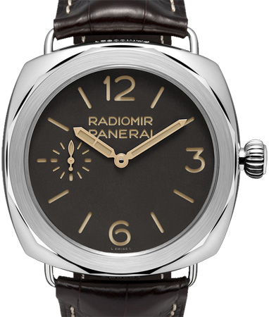 необхідності. Корпус із платини має той же діаметр 47 мм, що і первісна модель, і оснащений тонкими дротяними вушками для кріплення ремінця. Вушка є знімними, що дає можливість замінювати ремінець. Урожай вигляд годинника посилює оригінальна заводна головка сферичної форми. Циферблат цієї моделі відрізняє характерний для всіх годинників Panerai строгий та лаконічний дизайн, що забезпечує максимальну чіткість та оптимальну читаність показань. Темно-коричневий циферблат елегантно контрастує із люмінесцентним матеріалом кольору екрю, яким покритий нижній диск класичної двошарової конструкції. Подібно до історичних моделей Panerai, циферблат, обрамлений 12-гранним безелем з матовою обробкою, що контрастує з полірованим корпусом, захищений злегка опуклим склом Plexiglas®. Нова модель Radiomir Platino, що випускається лімітованими серіями по 100 примірників в кожній, пропонується з коричневим ремінцем з крокодилової шкіри з застібкою, що розкладається, з білого золота. Натхнена водонепроникним оригінальним годинником, нова модель має водонепроникність до 50 метрів.