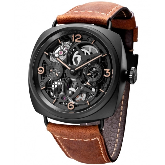 Ще раз хочеться сказати про почуття стилю, у марки OFFICINE PANERAI він безперечно є. Так, наприклад, у представленій до нинішнього Женевського салону (SIHH 2010) 30-штучну версію, засновану на калібрі P. 2005 - Radiomir Tourbillon GMT Ceramica, версію виконану в невластивому марці стилі скелетон. риси марки. Більше того, завдяки ґратам, подібним до ґрат старовинного водолазного шолома, модель впевнено продовжує військово-морську тематику. 48мм корпус навпроти виконаний із надсучасної кераміки на оксиді цирконію. Сапфірове скло 1.9мм завтовшки з подвійним антирефрексивним покриттям та сапфірове скло з боку задньої кришки. Водостійкість – 100 метрів.