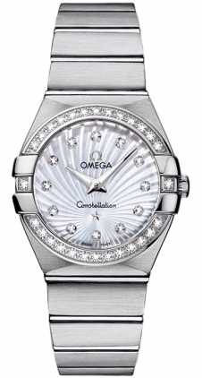 Надзвичайно ефектний дизайн годинника OMEGA Constellation пройшов перевірку часом. Його характерною особливістю стали знамениті дужки з боків годинного корпусу та вражаючі циферблати. Ця сатинована модель має білий перламутровий циферблат з візерунком Supernova та діамантовими годинниковими мітками, який накритий стійким до подряпин сапфіровим склом. Прикрашений діамантами безель закріплений на корпусі діаметром 27 мм із нержавіючої сталі, який доповнений сталевим браслетом. У цьому годиннику використовується високоточний кварцовий механізм OMEGA, калібр 1376. Випукло, стійке до подряпин сапфірове скло з покриттям антивідблиску/калібр: Omega 1376 Кварцовий годинниковий механізм з родієвим покриттям. Запас ходу: 41 місяць