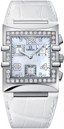 Випукло, стійке до подряпин сапфірове скло. Корпус Сталь. Циферблат: білий перламутровий з діамантами. Калібр: Omega 5200. Кварцовий годинниковий механізм із родієвим покриттям. Годинна, хвилинна та мала секундна стрілки, центральна стрілка хронографа, підсумовуючий лічильник на 12 годин 30 хвилин та 1/10 секунди. Запас ходу: 46 місяців. Особливості: Діаманти; Хронограф; Мала секундна стрілка.