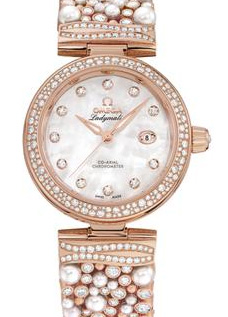 De De Ville Ladymatic Red Gold Pearl Diamond 2013 являє собою привабливе поєднання неординарного дизайну та новаторського підходу до годинникового мистецтва, нове поєднання діамантів та перлів. Вона розроблена спеціально для представниць прекрасної статі, які вибирають собі годинник не тільки на вигляд, але і за їх технічними характеристиками. Ця модель De Ville Ladymatic Red Gold Pearl Diamond 2013 має чисто-білий перламутровий циферблат з діамантовими годинниками, візерунком Supernova і віконцем вказівника дати в положенні «3 години». Вишуканий циферблат захищений стійким до подряпин сапфіровим склом. Прикрашений різнорозмірними діамантами безель закріплений на корпусі діаметром 34 мм із рожевого золота, який доповнений унікальним золотим браслетом інкрустованими перлами та діамантами. Торець корпусу прикрашений кільцем хвилястого рельєфу із білою керамічною вставкою. Прозора задня кришка дозволяє в деталях розглянути коаксіальний калібр OMEGA 8520. Автопідзавод, коаксіальний спуск для незмінної точності і довговічності механізму, регулятор баланс-спіраль, що вільно коливається, з кремнієвою спіраллю балансу. Інерційний сектор із двостороннім обертанням для прискорення підзаводу. Родиєве покриття та ексклюзивний декор Женевські хвилі.