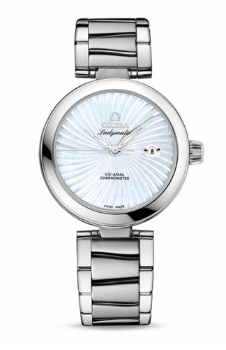 Новий годинник Ladymatic втілює в життя кожної жінки граціозність і елегантність. Цей годинник – справжній подарунок для прекрасної половини людства, що мріє про високоточний механічний годинник із сучасним модним дизайном. Під хвилеподібним візерунком полірованого корпусного кільця можна побачити ще одне кільце – з кераміки. Годинник розміром 34 мм, корпус виконаний із нержавіючої сталі. Заводна головка прикрашена діамантом фірмового ограновування або логотипом Omega. Крізь сапфірове скло зворотного боку можна розглянути механізм годинника. Механізм годинника кварцовий, калібру Omega 8520/8521 . Всі годинники серії Ladymatic є офіційно сертифікованими хронометрами, що свідчить про бездоганну точність ходу. Циферблат прикрашений візерунком нагадує промені, що розходяться з центру. Апертура дати розміщена на позиції 3-х годин. Стрілки виконані зі сталі та покриті білим складом Суперлюмінова, що дозволяє дізнатися час за будь-якого освітлення. Годинник представлений з браслетом зі сталі або з ремінцем зі шкіри алігатора в тон циферблату, з розкладною застібкою має особливу запатентовану компанією Omega конструкцію, що складається з трьох рядів ланок.