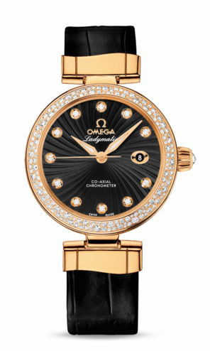 Новий годинник Ladymatic втілює в життя кожної жінки граціозність і елегантність. Цей годинник – справжній подарунок для прекрасної половини людства, що мріє про високоточний механічний годинник із сучасним модним дизайном. Під хвилеподібним візерунком полірованого корпусного кільця можна побачити ще одне кільце – з кераміки. Годинник розміром 34 мм корпус може бути виконаний з нержавіючої сталі, жовтого або рожевого золота 18 карат. Безель годинника може бути у двох варіантах: полірований або інкрустований діамантами. Заводна головка прикрашена діамантом фірмового ограновування або логотипом Omega. Крізь сапфірове скло зворотного боку можна розглянути механізм годинника. Механізм годинника кварцовий, калібру Omega 8520/8521 . Всі годинники серії Ladymatic є офіційно сертифікованими хронометрами, що свідчить про бездоганну точність ходу. Циферблат прикрашений візерунком нагадує промені, що розходяться з центру. Циферблат також може бути прикрашений 11 діамантами замість годинникових міток. Апертура дати розміщена на позиції 3-х годин. Стрілки виконані із золота та покриті білим складом Суперлюмінова, що дозволяє дізнатися час при будь-якому освітленні. Годинник представлений із браслетом зі сталі або рожевого, жовтого золота, з ремінцем зі шкіри алігатора в тон циферблату. Браслет з розкладною застібкою має особливу запатентовану компанією Omega конструкцію, що складається з трьох рядів ланок.