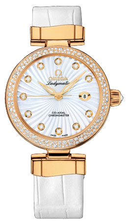 Механізм автоматичний, Калібр Omega 8521 Розміри корпусу 34 мм Корпус жовте золото 18к Особливості Водостійкі, Хронометр Функції години, хвилини, секунди, дата Циферблат білий перловий гільошований 100 м, безель з білих діамантів