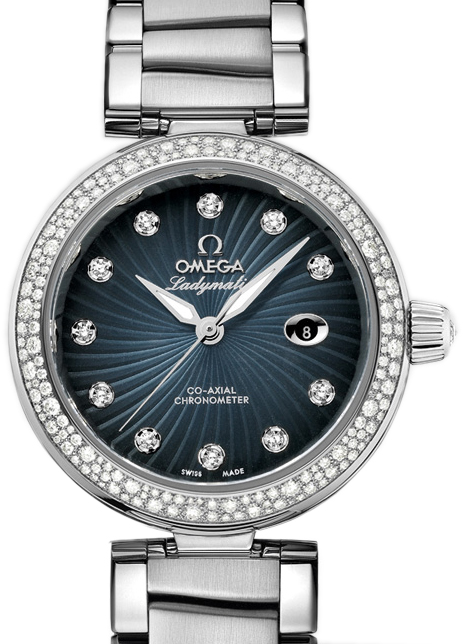 У 2013 році мануфактура оновила циферблати на годинник Ladymatic, які втілюють у життя кожної жінки граціозність та елегантність. Цей годинник – справжній подарунок для прекрасної половини людства, що мріє про високоточний механічний годинник із сучасним модним дизайном. Під хвилеподібним візерунком полірованого корпусного кільця можна побачити ще одне кільце – із синьої кераміки. Годинник розміром 34 мм, корпус виконаний із нержавіючої сталі, безель інкрустований білими діамантами. Заводна головка прикрашена діамантом фірмового ограновування або логотипом Omega. Крізь сапфірове скло зворотного боку можна розглянути механізм годинника. Механізм годинника з автопідзаводом, калібру Omega 8520/8521 із запасом ходу 50 годин. Всі годинники серії Ladymatic є офіційно сертифікованими хронометрами, що свідчить про бездоганну точність ходу. Циферблат прикрашений візерунком нагадує промені, що розходяться з центру. Циферблат може бути прикрашений 11 діамантами замість годинникових міток, має глибокий синій колір. Апертура дати розміщена на позиції 3-х годин. Стрілки виконані зі сталі та покриті білим складом Суперлюмінова, що дозволяє дізнатися час за будь-якого освітлення. Годинник представлений з браслетом зі сталі або з ремінцем зі шкіри алігатора в тон циферблату, з розкладною застібкою має особливу запатентовану компанією Omega конструкцію, що складається з трьох рядів ланок.
