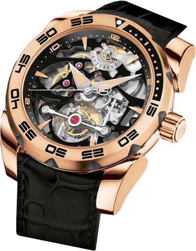 Чоловічий механічний годинник з ручним заводом. Корпус 53 x 37.2 мм, з 18К. рожевого золота. Циферблат - чорний із сріблястим. Безель, що обертається. Запас ходу 7 днів. Ремінець – шкіра алігатора з платиновою вставкою, відкидна застібка.