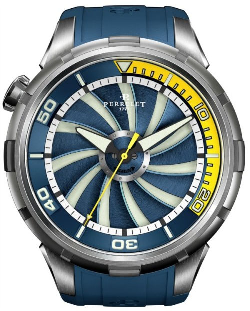 Ще одна дайверська модель, що нечасто зустрічається в асортименті годинникової марки Perrelet. З годинником Turbine Diver компанія повернулася до звичнішого для себе - фірмового дизайну, коли ротор автопідзаводу винесений на лицьову сторону. Тільки тепер одинадцятилопастний ротор пропонується асоціювати з гвинтом сучасного підводного човна. Він ніби ширяє над покритим люмінесцентним складом нижнім рівнем циферблату.