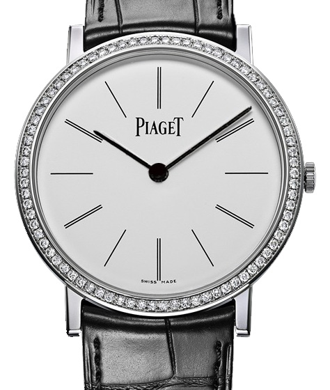 Ультратонкий механічний годинник, біле золото, діаманти Створення цієї чудової моделі, в якій гармонійно поєднуються суворі пропорції та елегантна стриманість, стало можливим завдяки винятковій артистичній майстерності дизайнерів Piaget. Сяйво діамантів підкреслює бездоганну геометрію корпусу з білого золота. У серці цього емблематичного годинника таїться ультратонкий механізм Piaget 430P. Досконала механіка безроздільно править у своїх розкішних володіннях. Годинник Piaget Altiplano, 38 мм. Корпус із білого золота 18 карат із 78 діамантами круглого огранювання (близько 0,7 карата). Ультратонкий мануфактурний механізм Piaget 430P із ручним заводом.