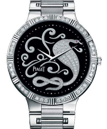 Ультратонкий корпус, витончено прикрашений обідок, гнучкий браслет, візерунок у вигляді подвійного ряду рельєфних форм – цей декор, що вже став доброю традицією Piaget, чудово поєднується з новими екзотичними елементами. Зображені на циферблаті годинника 12 символів китайського зіркового календаря вдало відтінюються виконаною із чорного онікса задньою стінкою. Ця модель прикрашена знаком Змії: блиск прикрашають зображення діамантів надає їй неповторної вишуканості. Змія розумна і некваплива: її мудрість дозволяє їй робити правильні висновки з помилок минулого і правильно вибирати свій шлях.