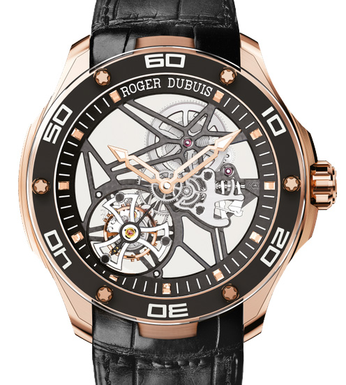 «Скелетон» – Чорний фланець – Білий декалькований напис ROGER DUBUIS та хвилинна шкала – Накладні мітки з рожевого золота.