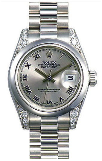 Жіноча модель Datejust 31mm у платині, дуже елегантна. Корпус із платини інкрустований 24 діамантами. Циферблат родієвий із римськими цифрами. Механізм із автопідзаводом на 31 камені, Caliber 3130, запас ходу 42 години. Браслет President із платини.
