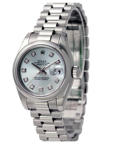Жіноча модель Datejust 31mm у платині, дуже елегантна. Циферблат блакитний із 10 круглими діамантами. Механізм із автопідзаводом на 31 камені, Caliber 3130, запас ходу 42 години. Браслет President із платини.