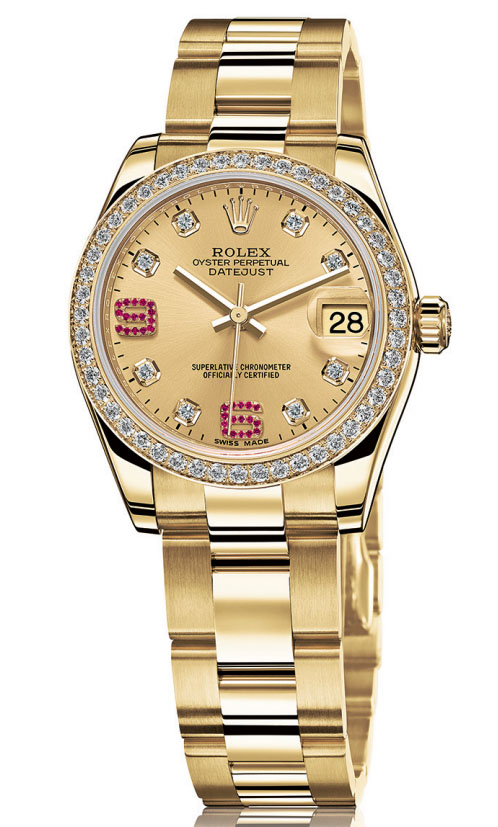 Безель оправлений 48 діамантами. Дата, що швидко встановлюється, з можливістю оперативної корекції на позначці 3 годин. Завод автоматичний, у двох напрямках за допомогою ротора Perpetual. Вартові мітки – 8 діамантів в оправі з 18-каратного золота. Великі цифри 6 та 9 з 18-каратного золота, кожна в оправі з 16 рубінів. Браслет Oyster (3 ряди), масивні ланки, матеріал 18-каратне жовте золото. Прихована застібка Crownclasp з пряжкою, що розкладається.