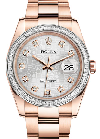 Корпус моделі Oyster, 36 мм, золото Everose, безель інкрустований багетними діамантами. Автоматичний підзавод у двох напрямках за допомогою ротора Perpetual. КАЛІБР 3135, мануфактурного виробництва Rolex. Центральні годинна, хвилинна та секундна стрілки. Дата, що миттєво встановлюється, з можливістю швидкого коригування. Можливість зупинки секундної стрілки для точного часу.