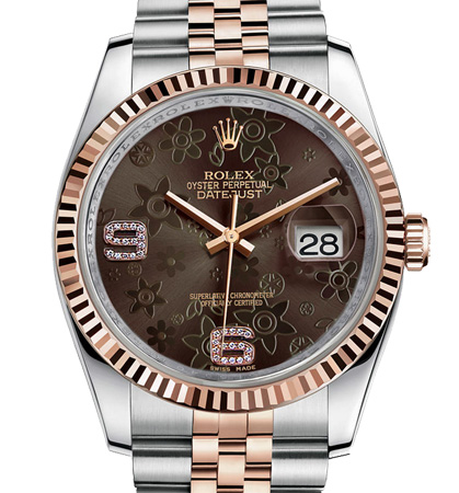 У ранніх моделях Datejust дата починала змінюватися за кілька годин до півночі. У 1955 році у годинника з'явився механізм перемикання дати миттєвої дії, а для зручнішого зчитування показань у віконце індикації дати було вміщено лінзу зі збільшенням у 2,5 рази. Гармонійне поєднання діамантів, золота та сталі в ефектному корпусі діаметром 36 мм. У моделі Datejust 36 мм встановлений калібр 3135 з автоматичним підзаводом, повністю розроблений та виготовлений майстрами Rolex. Як і всі механізми Rolex Perpetual, калібр 3135 має сертифікат швейцарського хронометра, що видається надточним годинникам, що успішно пройшли тестування в Офіційному швейцарському інституті хронометрії (COSC). Конструкція, однакова всім механізмів колекції Oyster, надає моделі незрівнянну надійність. Сталь 904L та 18-каратне золото Everose. Рифлений фірмовий безіль. Браслет - Jubilee з рожевого золота та сталі. Фірмовий бронзово-шоколадний, квітковий мотив циферблату, арабська цифра 9 та 6 інкрустована діамантами.