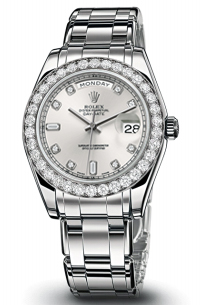 Rolex Oyster Perpetual Day-Date Special Edition Watches (The Rolex Masterpiece). Розмір корпусу 39мм у платині, безель з 40 діамантами, циферблат серій, 8 діамантів та 2 багетних діамантів на годиннику циферблату, Браслет Oyster з платини 20мм.