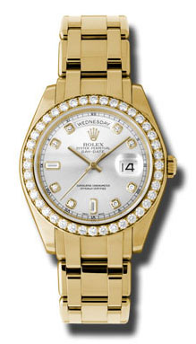 Rolex Oyster Perpetual Day-Date Special Edition Watches (The Rolex Masterpiece). Розмір корпусу 39мм у жовтому золоті, безель з 40 діамантами, сріблястий циферблат, 8 діамантів та 2 багетних діамантів на годиннику циферблату, Браслет Oyster з жовтого золота 20мм.