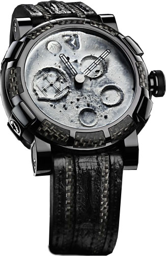 Близько півмільйона кратерів, шар грунту з фрагментами комет і метеоритів, частинки скла, мінерали та пил завтовшки кілька метрів – така неоднорідна місячна поверхня. Циферблат ще одного концепту від Romain Jerome: Moon Dust-DNA Black Mood повторює поверхню єдиного супутника Землі. Годинник оформлений у рамках єдиної концепції: політ Apollo 11 до поверхні Місяця. Згідно з історичною хронікою Армбокг ступив на поверхню планети 21 липня 1969 о 02 годині 56 хвилин 20 секунд за Грінвічем - випуск серії символічно лімітований 1969 екземплярами.